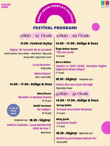 27-29-31 Ocak 2026 Baküs Sahne/Bahçeli Kültür Sanat İletişim: 05056601778 / 05066662614 Baküs Mini Çocuk Edebiyatı Festivalinde Buluşmak Üzere ✨ #bakusminicocukedebiyatifestivali #bakusmini