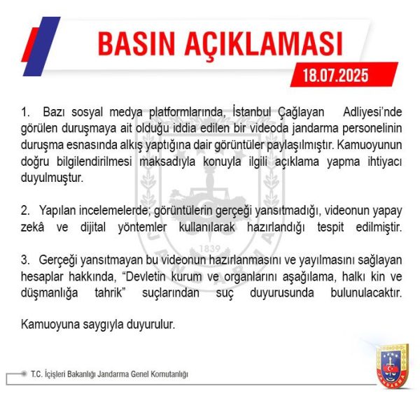 Bazı sosyal medya platformlarında, İstanbul Çağlayan Adliyesi’nde görülen duruşmaya ait olduğu iddia edilen bir videoda jandarma personelinin duruşma esnasında alkış yaptığına dair görüntüler paylaşılmıştır. Kamuoyunun doğru bilgilendirilmesi maksadıyla konuyla ilgili açıklama yapma ihtiyacı duyulmuştur.