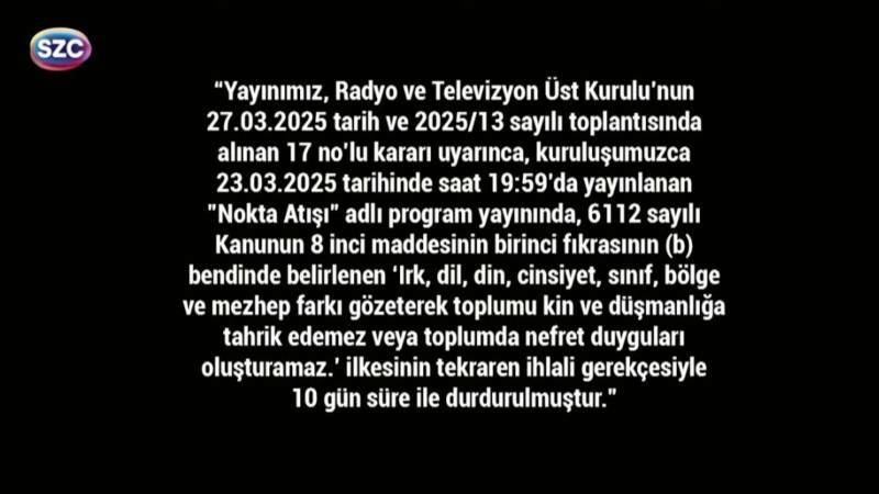 “Yayınımız, Radyo ve Televizyon Üst Kurulu’nun 27.03.2025 tarih ve 2025/13 sayılı toplantısında alınan 17 no’lu kararı uyarınca, kuruluşumuzca 23.03.2025 tarihinde saat 19:59’da yayınlanan “Nokta Atışı” adlı program yayınında, 6112 sayılı Kanunun 8 inci maddesinin birinci fıkrasının (b) bendinde belirlenen ‘Irk, dil, din, cinsiyet, sınıf, bölge ve mezhep farkı gözeterek toplumu kin ve düşmanlığa tahrik edemez veya toplumda nefret duyguları oluşturamaz.’ ilkesinin tekraren ihlali gerekçesiyle 10 gün süre ile durdurulmuştur.”